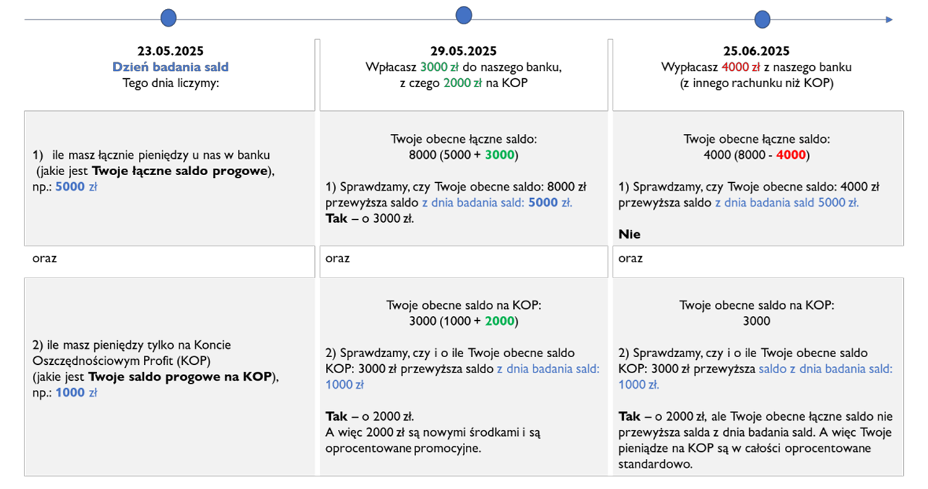Dzień badania salda w tej edycji promocji przypada na koniec dnia 23.05.2025 r. Bank zweryfikuje wówczas ile miałeś zgormadzonych środków na koncie osobistym, kontach oszczędnościowych, technicznych i lokatach. Nadwyżka ponad stan z 23.05.2025 r. to nowe środki, dla których uzyskasz promocyjne oprocentowanie 5,5%.